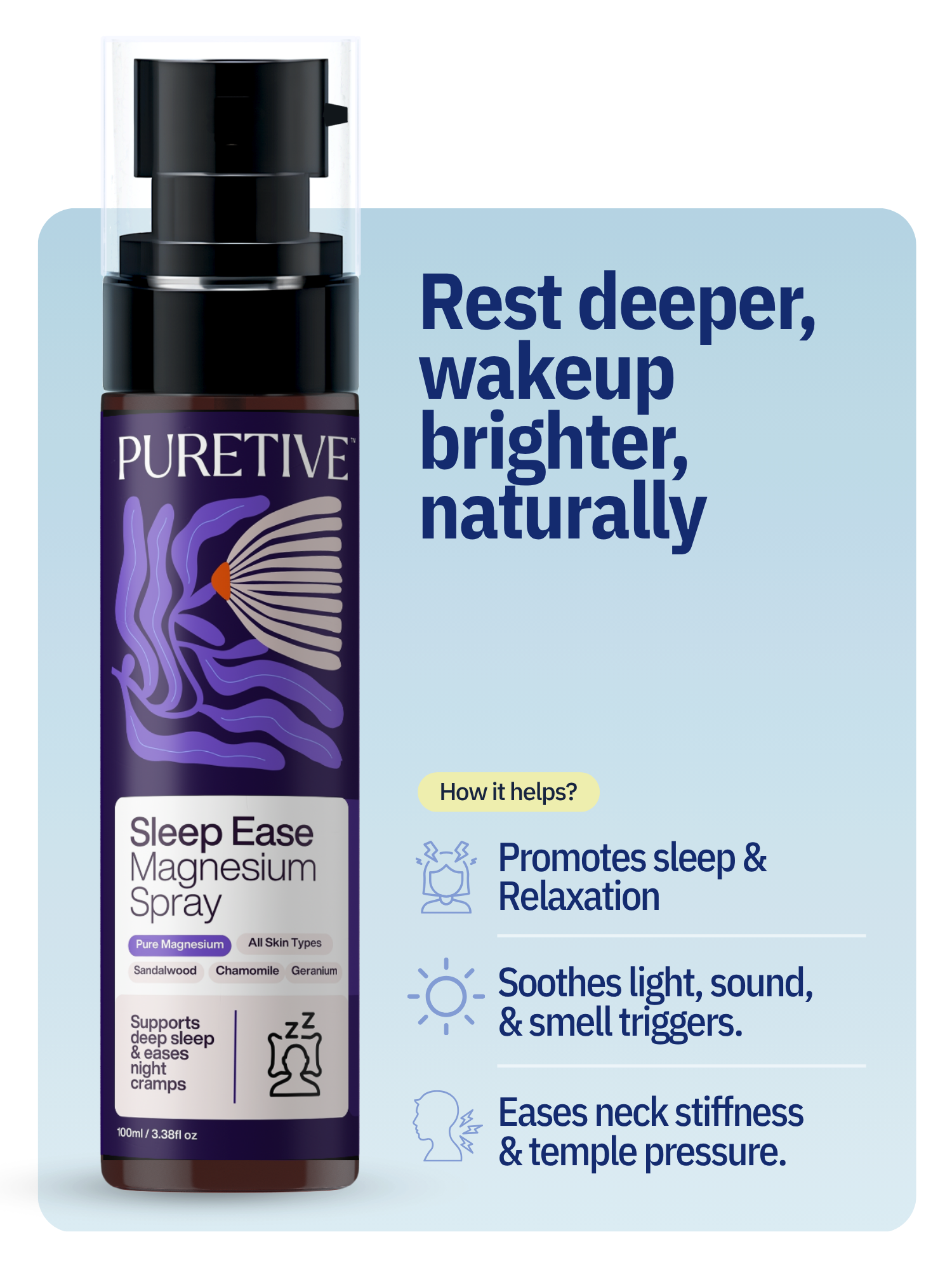 Sleep Ease Magnesium Oil Spray - Puretive - Lavender & Chamomile – Natural Transdermal Magnesium for Restless Legs, Muscle Relaxation & Deeper Sleep – Gentle Formula for Sensitive Skin (100ml) Promotes Deeper, Restful Sleep – Formulated to support natural magnesium levels, this spray helps calm the body and mind, making it easier to fall asleep and stay asleep through the night.